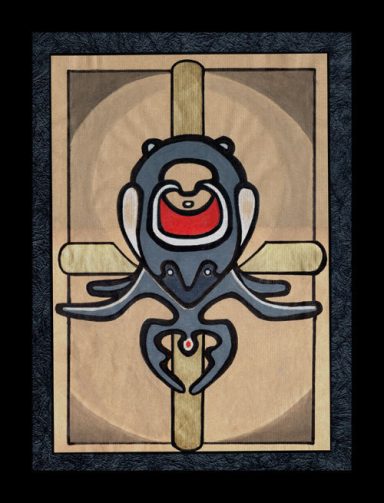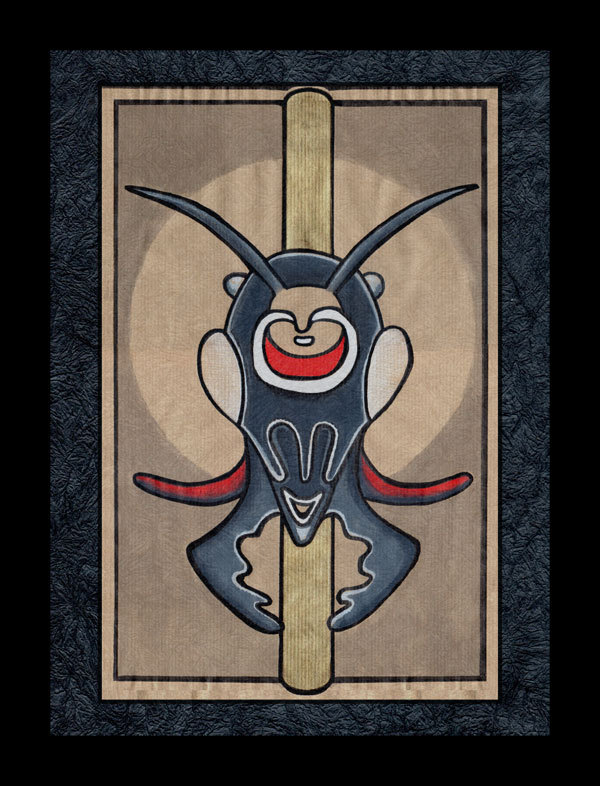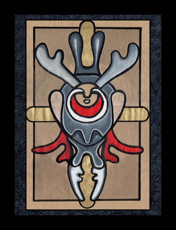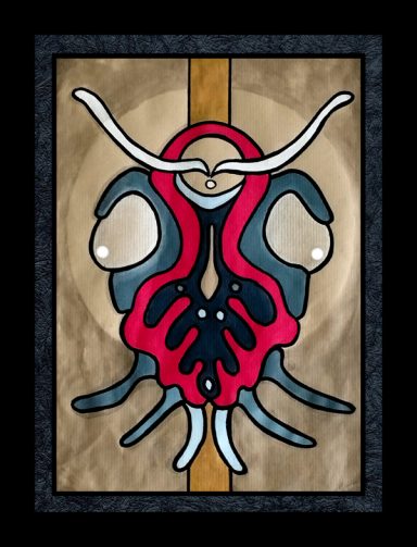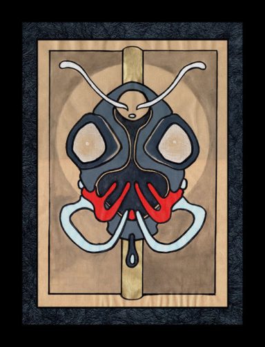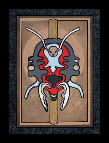 Un ensemble de neuf encadrement noirs dans lesquels se nichent des formes animales insectoïdes. La gamme chromatique est simple et se répète : noirs, gris, rouge et or.