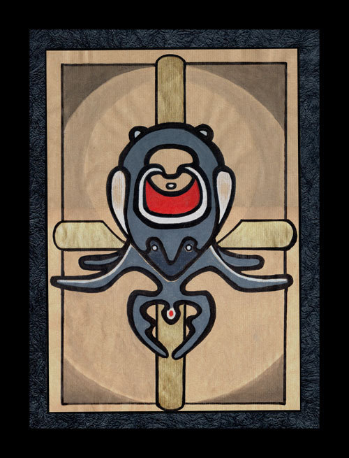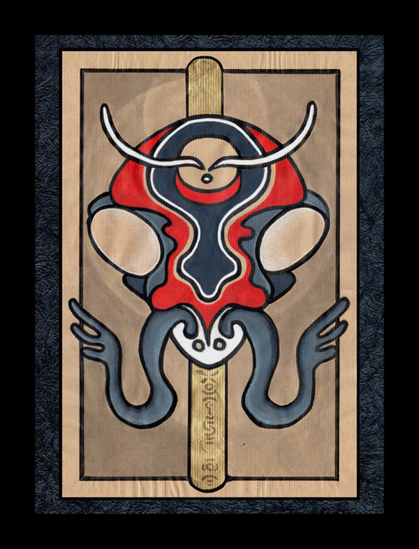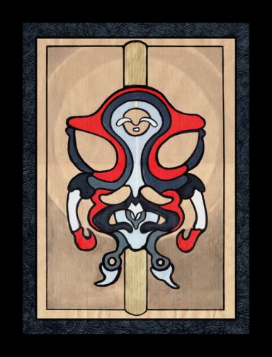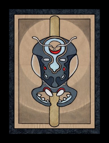 Chaque totem est accompagné d’un visage humain dont les yeux sont tantôt des antennes, tantôt forment un cercle. A l’arrière plan de ces entités, des supports verticaux ou cruciformes, possèdent des connotations religieuses, un lien entre le ciel et la terre. Nous sommes ici en présence d’une pièce mélangeant le profane et le sacré.